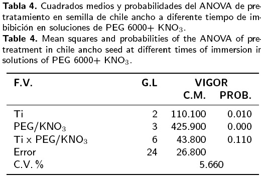 El ANVA para vigor en los niveles de 750 ppm de PEG 6000 más 200 ppm de KNO3 con diferente tiempo de inmersión muestra diferencia significativa (p < 0.05) solo para factores simples lo que indica que los tratamientos se comportan en forma diferente (Tabla 4). Por lo anterior, se presenta en la Figura 4 la respuesta del tiempo de inmersión para los tratamientos con 750 ppm de PEG 6000 más 200 ppm de KNO3 se observa que con 6 y 9 h de inmersión el vigor fue de 86% mientras que con 12 h fue de 80%, ambas superiores al testigo sin inmersión que solo germinó un 60%. Estos resultados mostraron similitud a los obtenidos por (Emmerich WE, Hardegree SP 1991. Crop. Sci. 31: 454.458) y (Sosa CJ, Motes JE 1982. J. Hort. Sci. 107: 290-295) que reportan que la semilla de chile en remojo por 5 a 10 h en AG3 estimula su germinación; tiempo similar al reportado por (Ruiz TNA, Ramírez MR, Rincón SF, Robledo TV, Díaz GC 2004. UAAAN pp.364-368) quienes concluyeron que la mejor capacidad germinativa se presento a las 12 h de imbibición en la semilla de chile ancho.