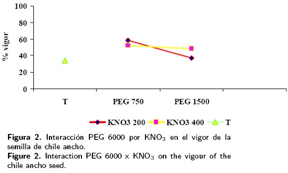El factor tiempo de inmersión en la solución de 750 ppm de PEG 6000 más 200 ppm de KNO3 mostró un efecto importante en el vigor de la semilla de chile observándose que se encuentra entre seis y nueve horas.
