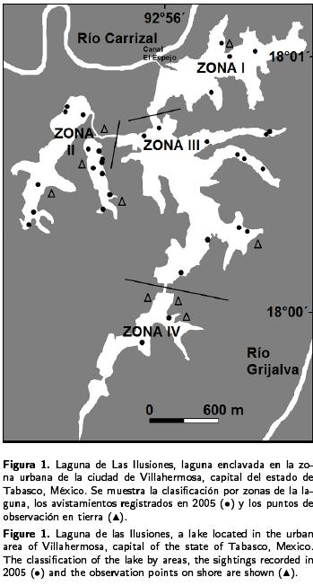 Laguna de las Ilusiones fue decretada Área Natural Protegida Estatal, con carácter de Reserva Ecológica para la conservación del cuerpo de agua, la flora y fauna (Anónimo 1995). Estuvo en el pasado conectada por el canal El Espejo al río Mezcalapa, que se deriva a su vez del Río Grijalva, esta laguna se cerró por las obras de urbanización de la ciudad de Villahermosa. El clima es cálido húmedo con lluvias en verano, con un rango de temperatura media anual de 24 a 28°C y precipitación total anual de 1500-2000 mm. La geología de la región es de tipo Cenozoica Sedimentario y el suelo es hidromático del tipo de los gleysoles eútricos y fluvisoles, que sostiene una vegetación hidrófila emergente y selvas bajas. Se ubica en la Región y cuenca hidrológica (RH30) Villahermosa-Usumacinta (Anónimo 1984). Para analizar los resultados, la laguna se dividió arbitrariamente en 4 zonas, con base en su fisiografía (Figura 1).