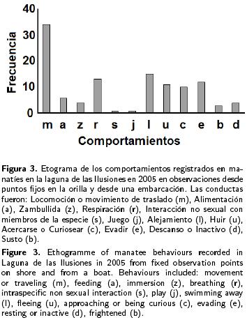 Se obtuvieron registros de la conducta desplegada por los manatíes localizados durante las navegaciones y desde los puntos fijos en tierra, por observación directa de manera ad libitum (Altman 1993) por individuo focal encontrado, con registro continuo para describir y nombrar las pautas conductuales más evidentes y registrables (Castelblanco-Martínez 2004), además de confirmar conductas descritas en las entrevistas, como el apareamiento, alimentación y juego.