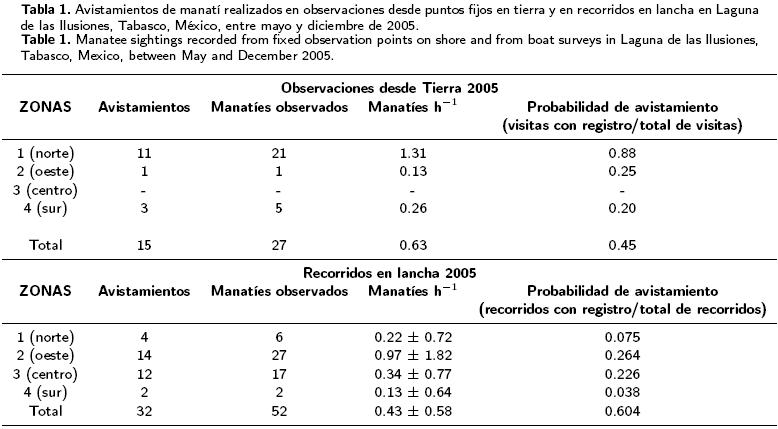 Se realizaron 53 recorridos completos en lancha en 2005, con un tiempo de esfuerzo de 121.22 h (Tabla 1), en estos recorridos se pudieron observar hasta 5 manatíes en un mismo día. En total se obtuvieron 52 registros de manatíes en toda la laguna, obteniendo 0.98 ± 1.32 manatíes por recorrido y 0.43 ± 0.58 manatíes h1 (Tabla 2).
