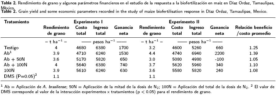 The high cost of maize fertilisation in Mexico reduces crop profitability and generates a need to find ecological and economic alternatives of biofertilisation based on the use of microorganisms that promote plant growth. The effect of Azospirillum brasilense (UAP154 strain) on maize grain yield was evaluated in two experiments established during 2001 in Diaz Ordaz, Tamaulipas, Mexico. Although no significant differences (p < 0.05) were detected, the A. brasilense inoculation increased grain yield compared with the non fertilised and non inoculated control in the second experiment carried out during autumn-winter, and on average of the two experiments, and increased the benefit/cost relationship by 56% on average.