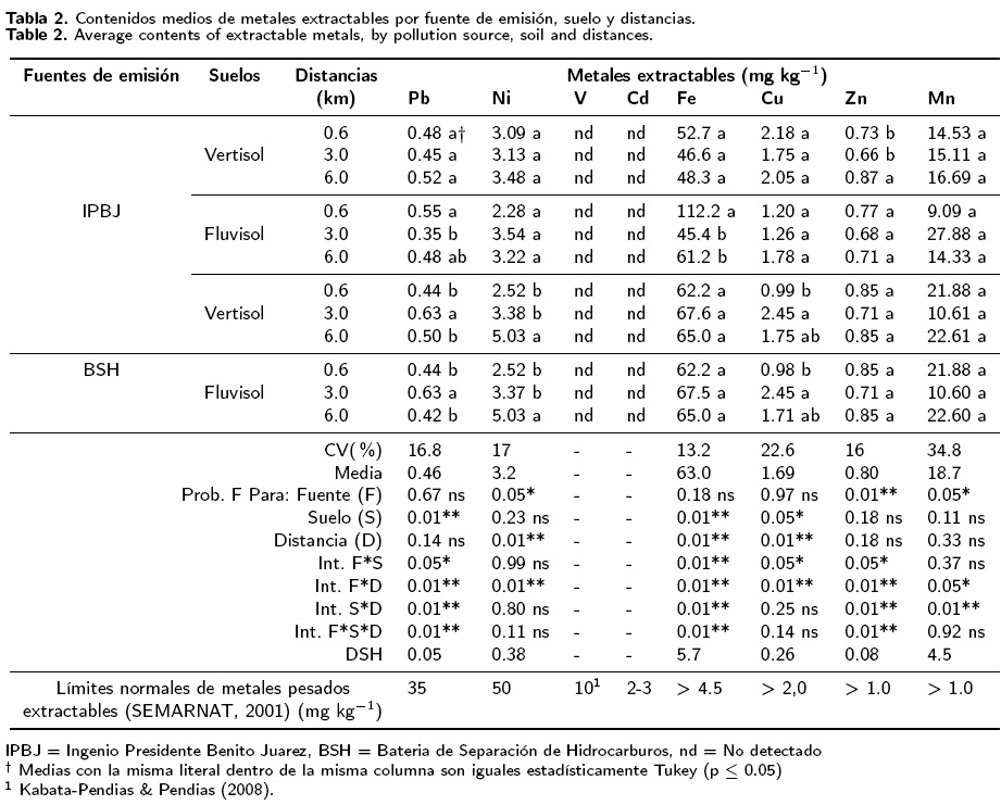 El hecho de que las concentraciones totales de Pb, V, Fe y Zn, se consideren como normales al estar por debajo de los niveles tóxicos (Ross 1994, USEPA 1993, SEMARNAT 2001) y que las concentraciones en los suelos del IPBJ fueran iguales estadísticamente (Tabla 1), es indicativo de que no existe un aporte importante de estos contaminantes por parte del IPBJ. Las variaciones en los niveles de Pb, V, Fe y Zn se atribuye a la génesis del suelo (Kabata-Pendias & Pendias 2008). En estudios realizados en derrames de hidrocarburos, se ha observado un incremento en la concentración de los metales Ni, Cu, Zn, Pb y V con 67.6, 24.7, 44.5, 18.4 y 82.7 mg kg-1 de suelo, respectivamente, que superan los límites críticos de la NOM-021-RECNAT-2000 (SEMARNAT 2001, Zavala et al. 2003, Siebe et al. 2005).
