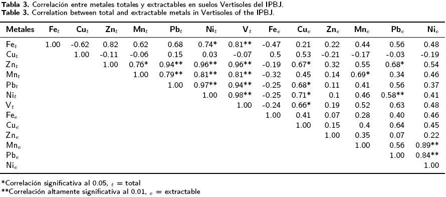 La falta de correlación entre los metales extractables Fe, Zn, Pb y V, y los metales totales indica que las propiedades de los suelos Fluvisoles y Vertisoles como pH, arcilla, materia orgánica y condiciones de reducción, favorecen o reducen la solubilidad de estos metales. La solubilidad de Ni, Cu y Mn, es deseable desde el punto de vista de la nutrición del cultivo de caña, ya que son micronutrimentos esenciales para este cultivo.