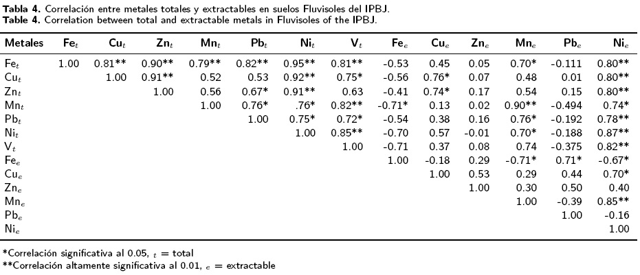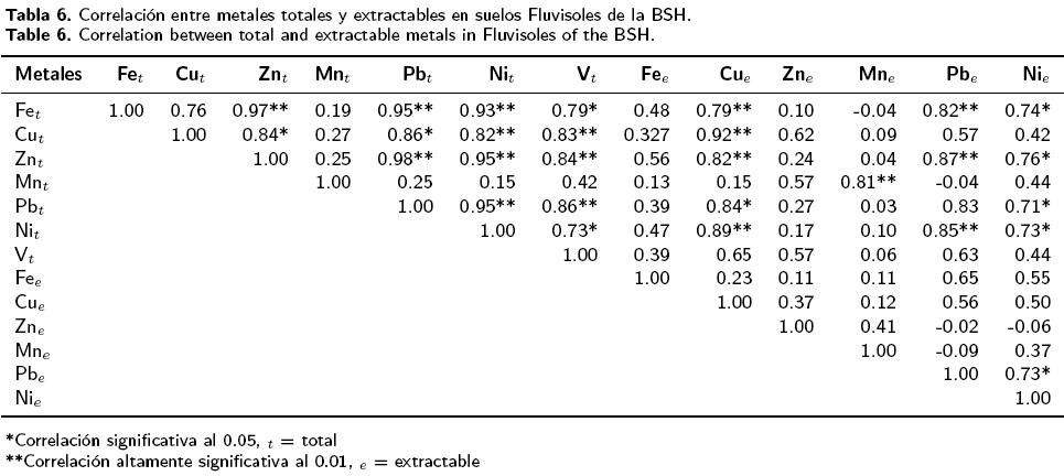 Los metales extractables Fe, Zn, Pb y V no se correlacionaron con su concentración en sus formas totales, excepto el Pb en el Fluvisol de la BSH (Tablas 3, 4, 5 y 6). Los metales extractables que mostraron correlación con los metales totales fueron Mn en los suelos de las dos industrias. Cu y Ni, se correlacionaron únicamente en los suelos Fluvisol del IPBJ y en ambos suelos de la BSH (Tablas 4 y 6).
