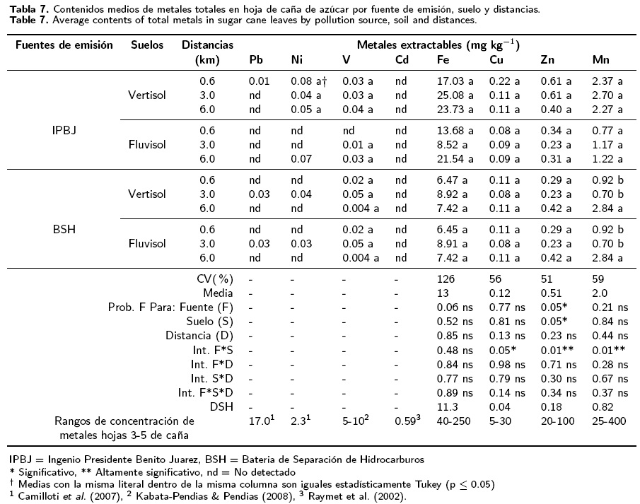 En el caso de Pb y V, son bajos comparados con los límites reportados para este cultivo (Tabla 7). Las concentraciones foliares de los metales pesados fueron iguales estadísticamente en las diferentes distancias de la fuente emisión. Con excepción del Mn que presentó significativamente mayor concentración en la distancia de 6 km, en ambos suelos de la BSH.