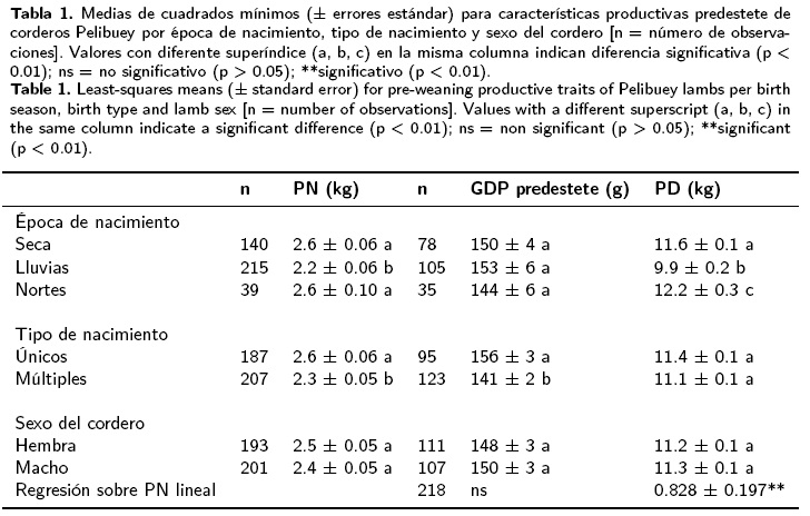 La época de nacimiento del cordero influyó sobre su PN; resultados similares a los registrados en el actual estudio son informados por Carrillo et al. (1987), quienes señalan que la época de nacimiento influye sobre el PN de los corderos Pelibuey, en donde los menores pesos se obtienen cuando los corderos nacen durante la época de lluvias con respecto a los que nacen en la época de seca (2.38 vs 2.49 kg, respectivamente).