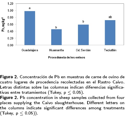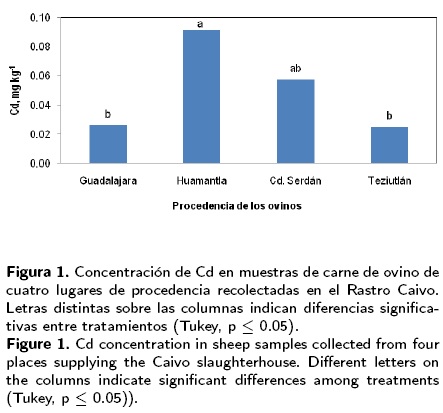 Las concentraciones de Cd establecidas como permisibles en carne de ovino van de 0.05 a 2 mg kg-1 (Reglamento CEE Nº 1881/2006 2006. Comisión del 19 de diciembre que fija el contenido máximo de determinados contaminantes en los productos alimenticios; CODEX STAN 193-1995 2006. Norma General del Codex para los contaminantes y las toxinas presentes en los alimentos Rev. 2-2006). Otros autores establecen que concentraciones de Cd de 0.001 mg kg-1 son consideradas como bajas (Alonso ML, Benedito JL, Miranda M, Castillo C, Hernández J, Shore RF 2000. Toxic and trace elements in liver, kidney and meat from cattle slaughtered in Galicia NW Spain). Considerando las referencias anteriores, las concentraciones de Cd determinadas en la carne procedente del rastro Caivo (Figura 1) no representan riesgos a la salud humana. Si bien, las muestras de este rastro muestran concentraciones de Cd aceptables; se observa en la Figura 1, que existieron diferencias estadísticas significativas (AN-DEVA F = 5.9, p > F = 0.0007) por efecto del lugar de procedencia de las muestras. Las concentraciones registradas en muestras procedentes de Guadalajara y Teziutlán fueron muy similares y son las menores registradas. Las muestras de Huamantla presentaron la mayor concentración de Cd; superando a las anteriores en casi 73%. No obstante, como ya se indicó, las concentraciones registradas se encuentran dentro de los valores permisibles para consumo humano.