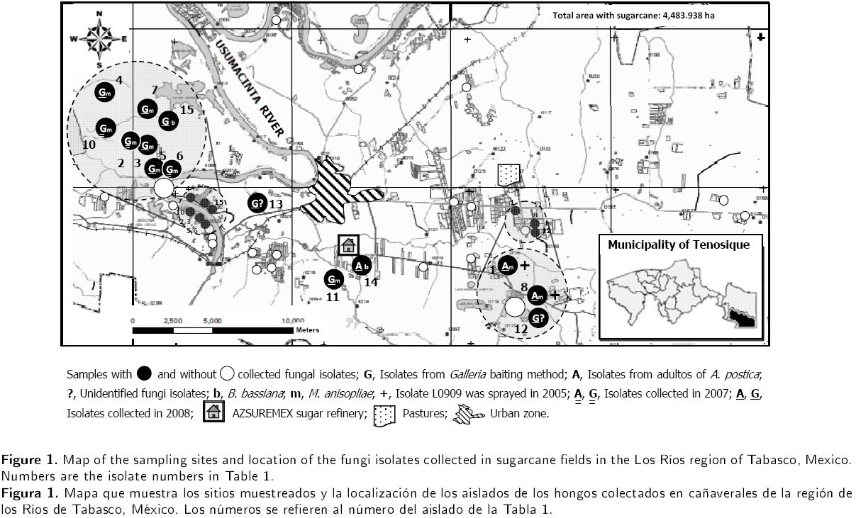 Regarding isolate geography, the two isolates obtained from A. postica were collected in the eastern area of the Los Rios region (Figure 1). Historically, sugarcane fields in this area have suffered more damage from this pest given the close proximity to pastures, and some sugarcane farmers have used M. anisopliae to control A. postica (Bautista-Gálvez & Gonzalez-Cortes 2005). It is worth mentioning that the soil in the sugarcane fields is even wetter in the western area of the region, where seven M. anisopliae isolates were collected (Figure 1), as this area tends to flood occasionally when the Usumacinta river overflows. The higher frequency of M. anisopliae in this area supports reports of increased fungus survival in wet soils (Zimmermann 2007). The presence of B. bassiana in the sugarcane fields was lower than that of M. anisopliae, with only two isolates, one obtained with the Galleria method and the other by capturing A. postica adults. The lower presence of B. bassiana was possibly because this fungus has not been applied to control other pests like the sugarcane borer Diatraea saccharalis (F.) in the Los Ríos region.