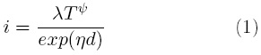 where i is rainfall intensity in mm h−1, d is the duration of the storm in minutes, T is the return period in years, and λ, ψ, η are nonlinear regression coefficients that vary with the place and the return period.