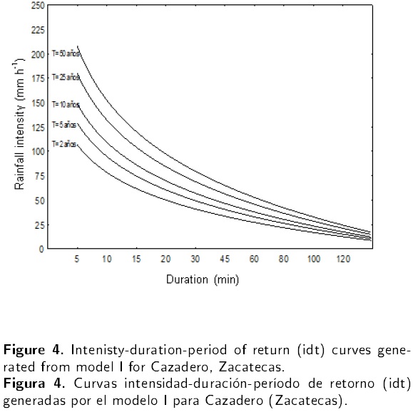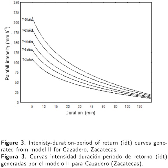 Finally, Figures 3 and 4 present, as an example, the idt curves for the return periods of 2, 5, 10, 25 and 50 years and durations of 5 at 120 min, from models I and II adjusted to the observed rainfall of Cazadero, Zacatecas during the 1963-1978 period.