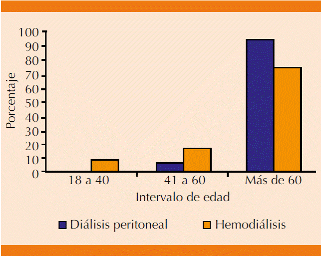 Los pacientes en diálisis peritoneal y hemodiálisis tuvieron edad media de 70.29±9.21 y 63.48±12.51 años, respectivamente. Los pacientes se dividieron en tres grupos con base en su edad: 18-40 años, 41-60 años y 60 años o más (Figura 2).