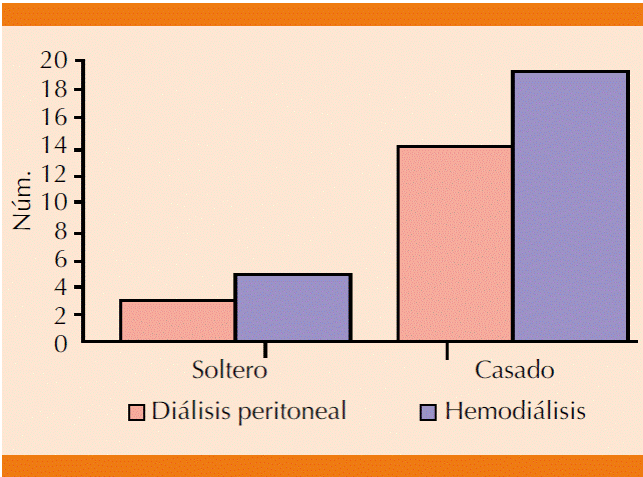 El número de pacientes casados fue significativamente mayor en el grupo de diálisis peritoneal (82%) que en el de hemodiálisis (76%). Figura 3