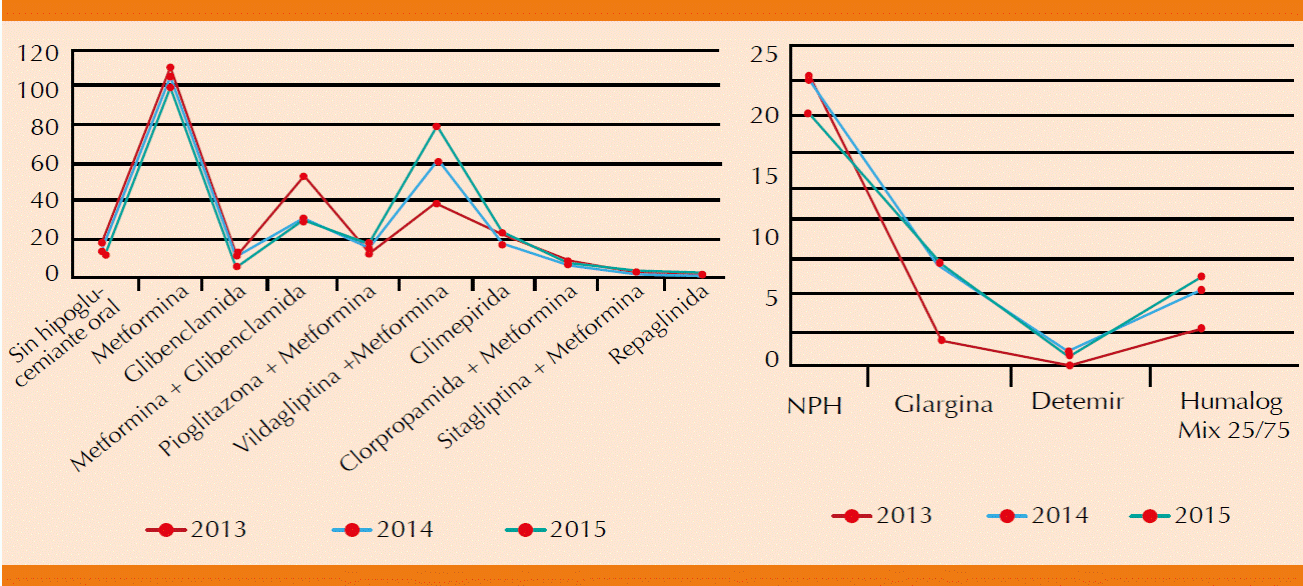 Los tipos de hipoglucemiantes orales administrados a ambos grupos (Figuras 1 y 2) fueron biguanida (metformina), grupo de sulfonilureas de primera generación (clorpropamida), de segunda generación (glicazida, glibenclamida), de tercera generación (glimepirida), tiazolidinedionas (pioglitazona) e inhibidores de dipeptidil peptidasa 4 (vildagliptina, sitagliptina). Las insulinas fueron de acción intermedia (NPH), prolongada (glargina, detemir) y mixta (insulina de acción intermedia + rápida). Los pacientes que no recibían hipo-glucemiante suspendieron el tratamiento 3 a 12 meses previos por indicación médica. Respecto a las mediciones de HbA1c anuales, el grupo con sobretratamiento tuvo dos mediciones; 60, 52 y 53% durante 2013, 2014 y 2015, respectivamente; 37, 38 y 37% tuvo tres mediciones en 2013, 2014 y 2015, respectivamente; 3, 5 y 5% tuvo cuatro mediciones en cada año de estudio, mientras que se hicieron una y cinco mediciones al año en 0, 2 y 2% durante 2013, 2014 y 2015, respectivamente.