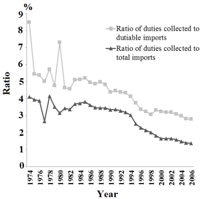 Figure 3 US average tariff, 1974 to 2006, Ratio of duties collected to total imports