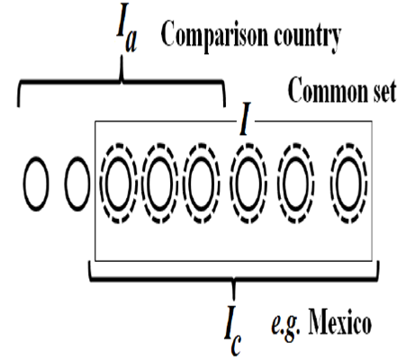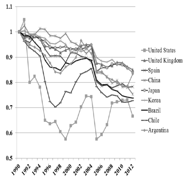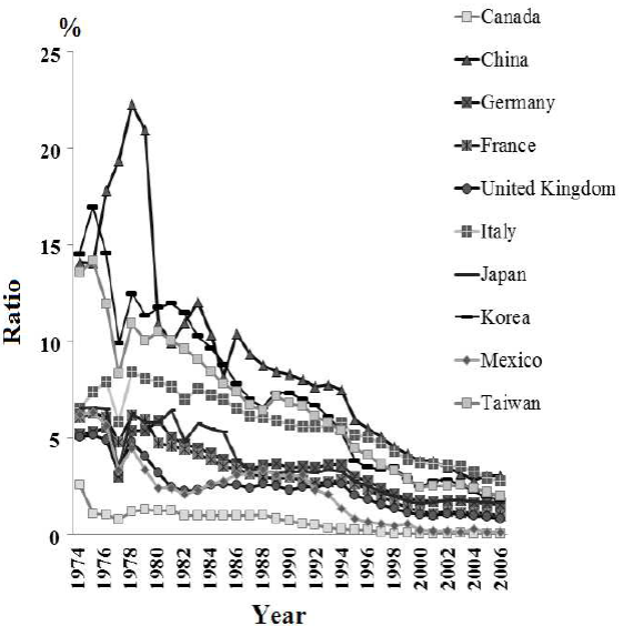 The correlation coefficient between Mexico and China in the original Feenstra and Kee index is extremely high (0.9748), while that in the Fisher index is 0.8939. The extremely high correlation coefficient (close to one) using Feenstra and Kee (2007)’s methodology is probably caused by the distortion of the index by the worldwide export value to the US in their methodology.