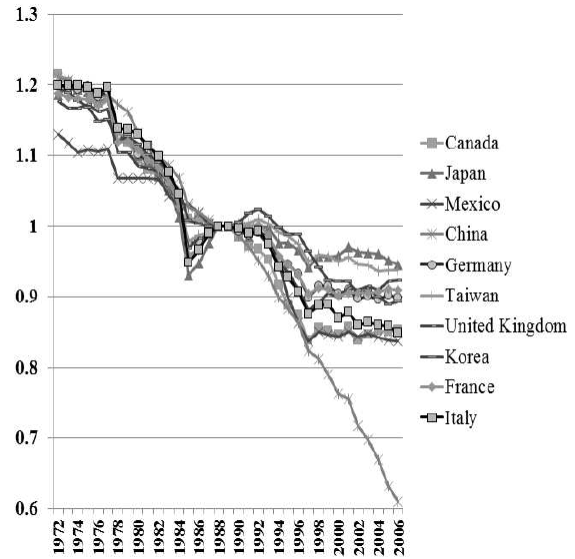 Figure 4 The evolution of the zero index in US imports from the 20 largest import partners plus Colombia and Chile: 1972-2006.