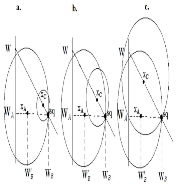 The aforementioned is known by the mayor, so that he will seek, during the period in which he governs, to worsen the living conditions of worse-off individuals by executing an inadequate and inefficient investment in public policies that benefit them. This will enable him to negotiate the votes at a lower price in the next electoral campaign, since a reduction in the endowments of wealth of worse-off individuals, ceteris paribus, will induce in them lower valuations of their votes. Therefore, the ideal point x A of the mayor, as an expression of their system of ends, is located in segment [(0,W A ),sq] such that the wealth endowments of social group V A don’t change (see Figures 2a, 2b and 2c).