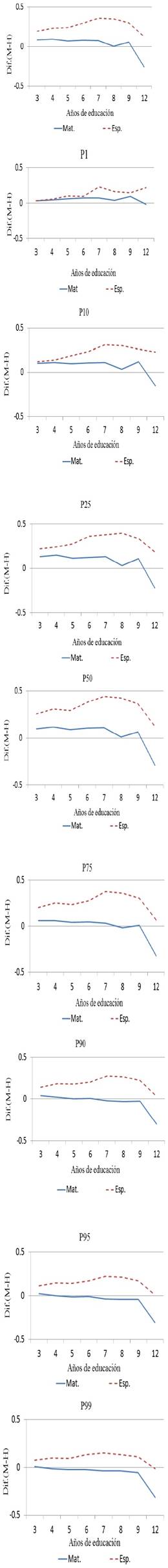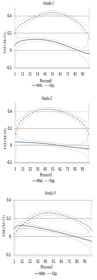 Los resultados indican que del tercer grado de primaria al nivel medio superior, las niñas presentan mayores niveles de puntaje que los niños en las pruebas de español. Esto es consistente con lo encontrado por Feingold (1988), Hedges y Nowell (1995), Guimaraes y Sampaio (2008), Fryer y Levitt (2010), Cornwell, Mustard y Van Parys (2013), INEE (2012a), INEE (2012b), INEE (2013), INEE (2014), Treviño y Treviño (2003, Backhoff et al. (2006), Backhoff et al. (2008a), Backhoff et al. (2008b), Aguilar, Miguel y Vázquez (2009). La brecha en español hasta secundaria es creciente conforme se avanza de grado.