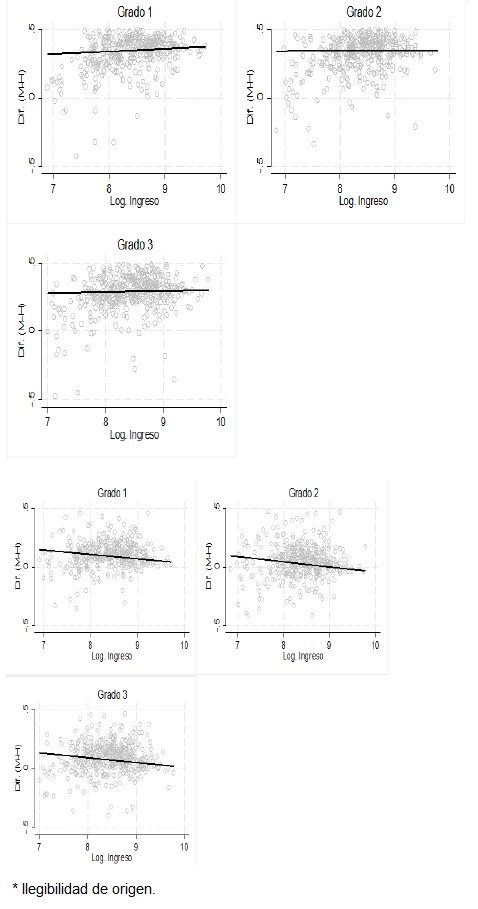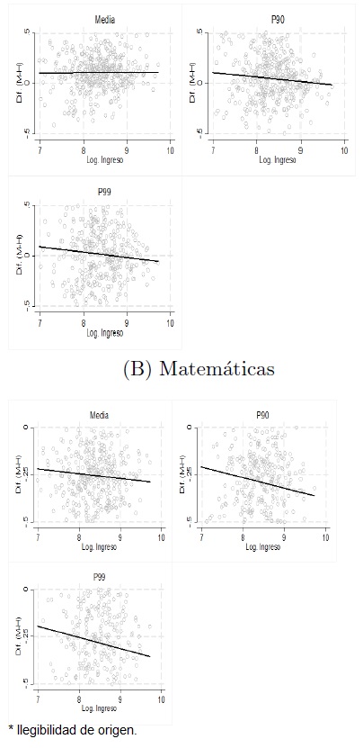 Dado que encontramos que los niños superan a las niñas en las pruebas de matemáticas en la parte alta de la distribución, en la gráfica 10 trazamos la brecha entre niñas y niños para los percentiles 90 y 99, como función del ingreso per cápita de los municipios, para analizar si la riqueza tiene algún efecto en la diferencia observada. Se puede notar que existe una relación negativa entre la brecha del puntaje y el ingreso, lo que indica que para los niveles de ingresos altos se pronostica que los niños superan a las niñas en matemáticas. Los efectos son más grandes que los encontrados en la media.22 Para el nivel medio superior, la relación negativa estadísticamente se mantiene, con efectos de -0.057 en el percentil 99 y de -0.032 desviaciones estándar para el percentil 90.