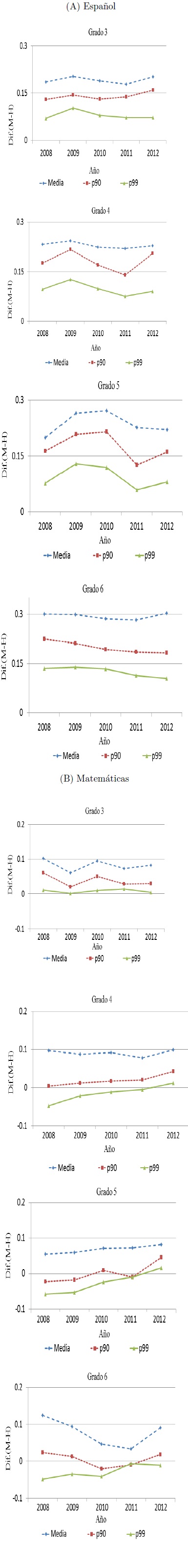 En primaria la brecha en el promedio entre cada grado se ha mantenido relativamente estable a lo largo del tiempo. La excepción ocurre para matemáticas en el sexto grado. Específicamente, entre los años 2008 y 2011 la brecha de género en la media se redujo cerca de 0.09 desviaciones estándar. No obstante, en 2012 aumentó nuevamente 0.06 desviaciones estándar respecto a la diferencia observada en en el año 2011.