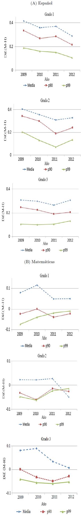 Para la parte alta de la distribución, es decir, del percentil 90 en adelante, el patrón observado en el resto de la distribución se mantiene para la materia de español. Es decir, se observa una ventaja en el puntaje para las niñas en todos los grados, ampliándose esta brecha en la secundaria y reduciéndose en el nivel medio superior. Incluso, en el percentil 99 de la distribución, en los resultados de español los niños aventajan en puntaje a las niñas, una diferencia de 0.012 desviaciones estándar.