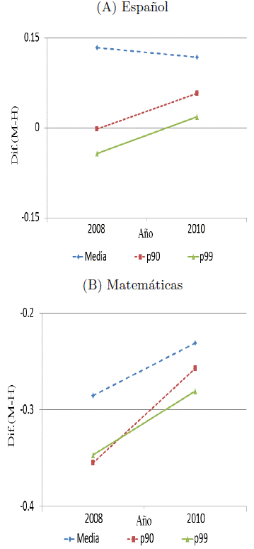 En el nivel medio superior, entre los años 2008 y 2010, la brecha de género en el promedio se redujo en matemáticas. Lo que concuerda con lo hallado por Hyde et al. (2008), Guiso et al. (2008) y Else-Quest, Hyde y Linn (2010), sobre un cierre de brechas en matemáticas. Lo mismo sucedió con la brecha en español. En general, lo encontrado es que las brechas de género en matemáticas al final de los niveles educativos se ha reducido en los años recientes.