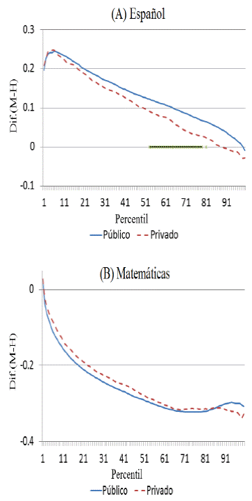En primaria y secundaria, la diferencia más grande en el puntaje entre niñas y niños ocurre en las escuelas particulares, manteniéndose el hecho de que en español las niñas tienen la ventaja en el puntaje en relación con los niños. Adicionalmente, los alumnos de escuelas privadas tienen mayores brechas en la parte baja de la distribución y después esta va decreciendo. Al final de la distribución, incluso, la brecha de género es estadísticamente la misma entre los tipos de escuela.