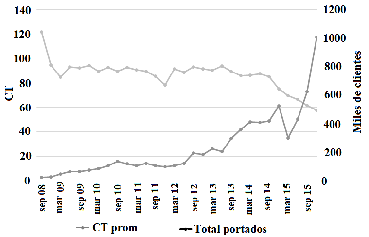 Como es de esperar el CT es mayor para el operador más grande que para el entrante Telefónica, aunque los diferentes CT tienden a la convergencia, lo que sugiere mayor competencia en precios entre operadores. Cabe destacar que el CT puede, incluso, ser negativo (como es el caso de los estimados para Telefónica), lo cual sugiere un bajo costo y una mayor propensión al cambio por parte de los usuarios, derivado, probablemente, del perfil de suscriptores que incluye personas con una valoración de su tiempo menor (pueden dedicar mayor tiempo a búsqueda de opciones), menor costo de aprendizaje, entre otras. Los CT se han reducido 127%, entre marzo de 2007 y diciembre de 2015, y 52% sólo entre junio de 2014, fecha en la que se modificó el esquema de PNM, y finales de 2015. Este es un primer indicio que sugiere que hay elementos que han reducido los inconvenientes asociados al cambio de operador en los servicios de telecomunicación móvil.
