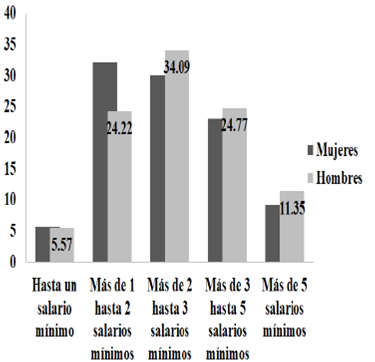 Cuando observamos el mercado informal en la gráfica 10 la situación se torna bastante diferente. Existe un sesgo hacia la parte baja de la distribución tanto para mujeres como para hombres. En promedio 55% de los hombres gana a lo sumo dos salarios mínimos en el mercado informal, por su parte, 72% de las mujeres gana a lo más dos salarios mínimos. Si el dato para los hombres no es desdeñable, la cifra para las mujeres es bastante significativa, pues más de dos terceras partes de ellas reciben un ingreso bajo. Este sesgo en contra de las mujeres bien puede deberse al tipo de ocupaciones que ellas realizan frente a los hombres o, en su defecto, a una probable discriminación salarial.