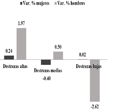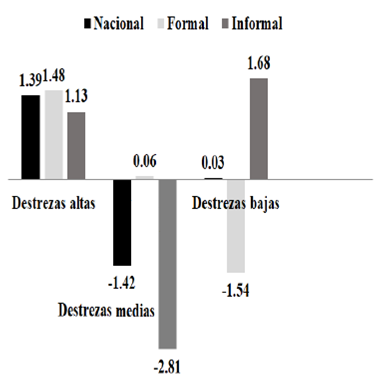 En la misma gráfica observamos que las mayores variaciones positivas en el empleo formal ahora se presentan en los segmentos de destrezas altas y medias, a saber, 1.48% y 0.06%, respectivamente. Sin embargo, la variación para destrezas bajas es negativa del orden de -1.54 por ciento. Situación que aún sigue reflejando cierta polarización sesgada hacia el perfil de destrezas más altas. Asimismo, en lo relativo al comportamiento del empleo informal según el nivel de destrezas. Resulta bastante notorio como se presenta una variación negativa del orden de -2.81% en las destrezas medias, por su parte, tanto las destrezas altas como las bajas reflejan una variación porcentual positiva de 1.13% y 1.68%, respectivamente. Esto, sin duda, refleja un claro comportamiento de polarización bimodal en el empleo informal.