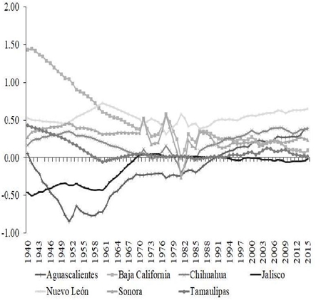 Durante 1940-2015 las regiones de México exhibieron convergencia, como saldo neto, aunque con una tendencia a frenarse. Este resultado coincide con el obtenido desde trabajos previos. Por ejemplo, mediante el análisis de las propiedades estocásticas de las series de PIB per cápita, Carrion-i-Silvestre y German-Soto (2007, 2009 y 2010) demostraron que es necesario considerar el cambio estructural ocurrido alrededor de los años ochenta para concluir que ha habido convergencia regional, de otra manera el proceso señala que no se ha convergido, pero esto es debido al sesgo originado a partir del cambio en la tendencia. Otros trabajos han llegado a conclusiones similares (German-Soto y Salazar, 2016; Rodríguez, Mendoza y Venegas, 2016). En el contexto del análisis β-convergencia, también hay similitud en la dirección de los hallazgos reportados por Cermeño (2001), Ayala, Chapa y Murguía (2011) y Díaz et al. (2017), entre otros.