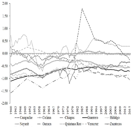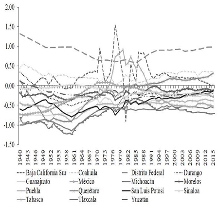 Al utilizar el PIB per cápita y la regionalización anterior es posible tener una idea de la disparidad de ingresos relativos en cada una de las muestras, desde un punto de vista gráfico e informal. Para ello se estiman las desviaciones de ingreso relativo entre cada estado y el correspondiente valor nacional (gráficas 1 a 3). Se observa una tendencia hacia la reducción de las diferencias a lo largo del periodo, proceso que se ve más claro en la muestra de estados de exposición alta que en la de exposición baja. Igualmente, se destaca que la reducción de la dispersión se presentó con mayor fuerza entre 1940 y mediados de los años ochenta, desde esa fecha parece revertirse (o al menos no parece continuar) entre estados de exposición media y baja. En cualquier caso, durante 1940-2015 parece haber, en promedio, reducción de las brechas de ingreso relativo, aunque regionalmente el proceso no fue similar.