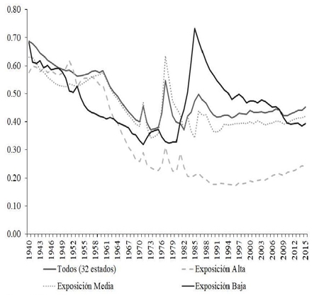 En general, hubo disipación de las desigualdades durante el periodo de economía cerrada, aun y agrupando las entidades federativas en función del grado de exposición a la globalización a la que fueron sometidas desde que se implementaron las reformas. Sin embargo, este proceso de reducción gradual cambió desde la apertura comercial.