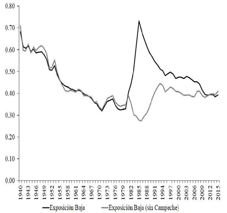 Asimismo, se aprecia que la pendiente de la curva fue más acentuada en la muestra de estados de exposición alta. Los años ochenta se caracterizaron por fluctuaciones inusuales que derivaron en aumentos y caídas repentinas del nivel de desigualdad regional; comportamientos que reflejan dos situaciones posibles. Primero, y particularmente para el estado de Campeche, el aumento y posterior caída de la tendencia parece deberse al incremento de la producción de petróleo que registró durante esos años, misma que luego se estabilizó cuando dejó de contabilizarse la extracción del recurso en las cuentas de la producción estatal. Segundo, las fluctuaciones pueden responder a la serie de eventos macroeconómicos registrados en el país, los cuales definieron el cambio estructural en la economía.