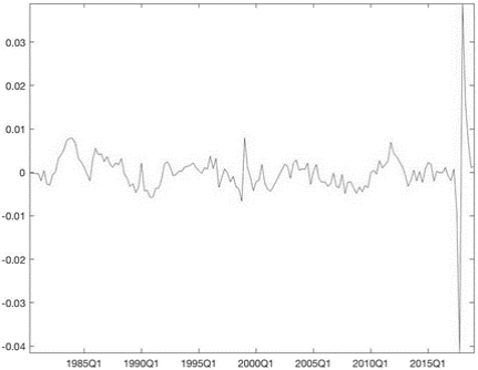 19Se utiliza el filtro Hodrick-Prescott de un lado y no la versión más popular de dos lados. Dado que el filtro de dos lados utiliza observaciones tanto pasadas como futuras para estimar la observación del ciclo en el presente, el mismo no se puede aplicar para estimar modelos DSGE, puesto que la estimación es recursiva y solo toma en cuenta datos del pasado para producir estimados del ciclo en el presente.