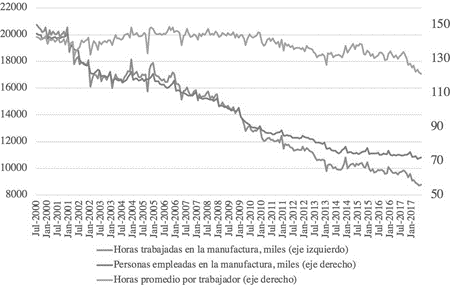 Gráfica 5 Horas trabajadas, número de personas empleadas en establecimientos y horas promedio por trabajador en la manufactura (julio 2000 a junio 2017)