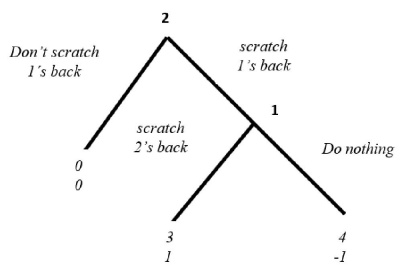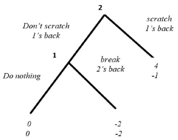 As the emotion of reciprocity can also make threats credible, I argue that the threat made by Player 1 to break Player 2’s back in figure 2 4 should be evaluated as unkind. If Player 2 doesn’t scratch Player 1’s back, then he is unkind to Player 1, who may want to carry out her threat in return. While a SRE only evaluates the threat of Player 1 if it is on the equilibrium path, namely if it is carried out, as both Klein and O’Flaherty (1993) and Schelling (1960) note, a threat is successful if it is not carried out. Because a threat that is not carried out is off the equilibrium path, a SRE does not assess the kindness of threats that are successful. I argue that the threat made by Player 1 should be evaluated as unkind, even if it is not carried out.
