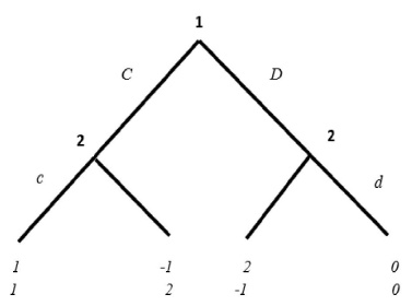 In the sequential Prisoner’s Dilemma presented in figure 3, Dufwenberg and Kirchsteiger (2004) argue that the emotion of reciprocity cannot render plausible unconditional cooperation by Player 2, as Player 2’s strategy includes the promise to cooperate even if Player 1 defects. They develop their solution concept of a SRE order to eliminate this incredible promise, with a SRE requiring each player to optimize at every history. In the aforementioned sequential Prisoner’s Dilemma, the SRE eliminates the incredible promise of unconditional cooperation by requiring that when Player 1 defects, Player 2 optimizes by also defecting.