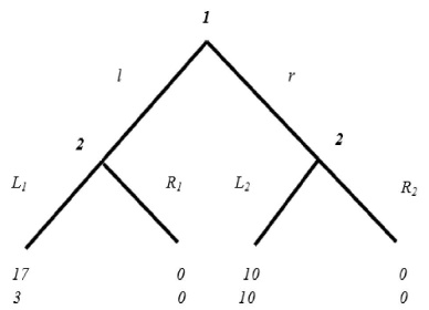 Güth et al. (2001) conducted an experiment with three variations of the Mini-ultimatum game shown in figure 5, using both the direct and strategy methods, in which they did not observe the SRE (r,(L 1,R 2)) being played. Twenty-six participants used the strategy method to play the game shown in figure 5, while none of the 13 participants that played as recipients used the strategy (L 1,R 2), nor did any of the 62 participants who played as recipients using all variations in the strategy method.