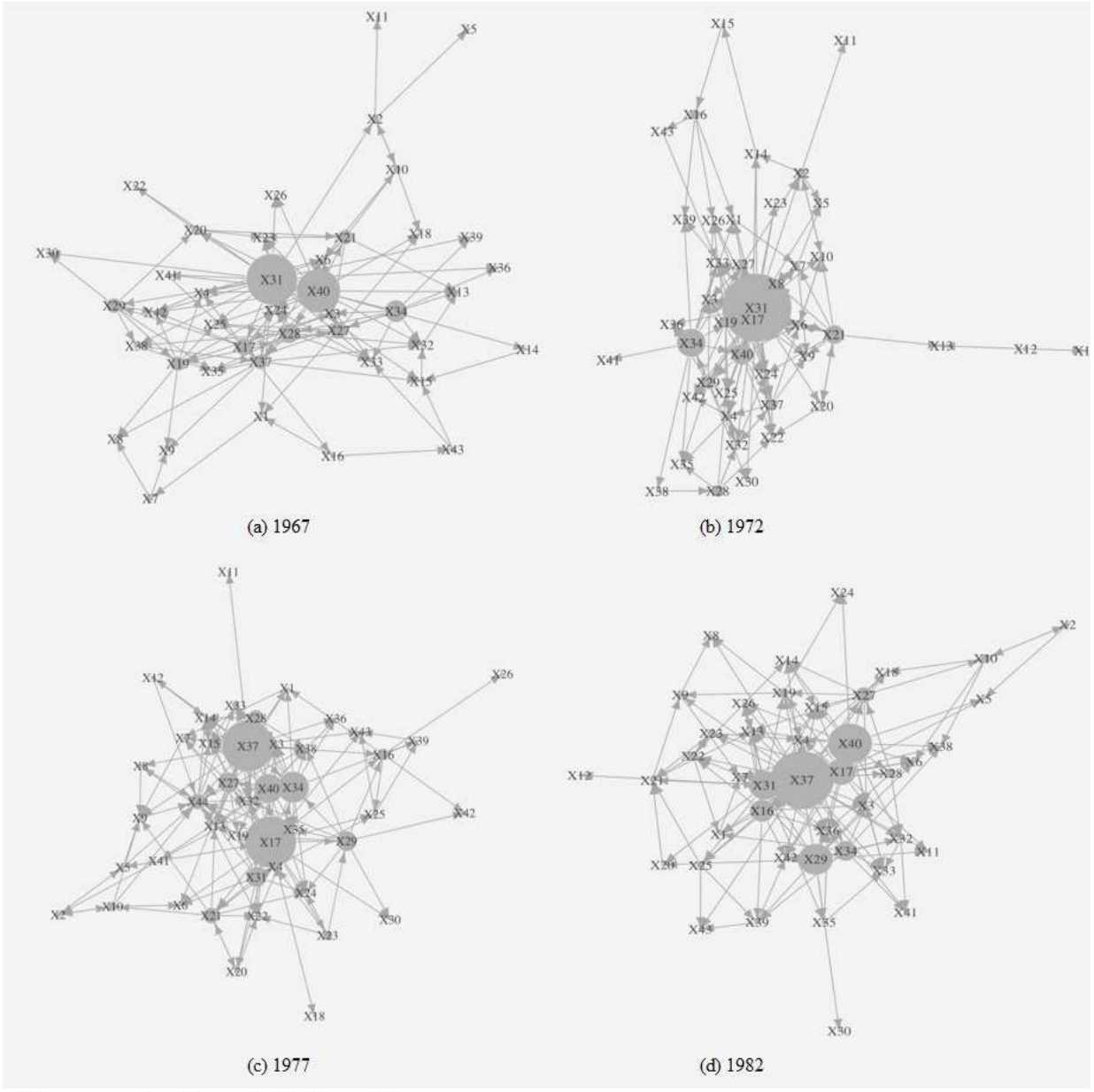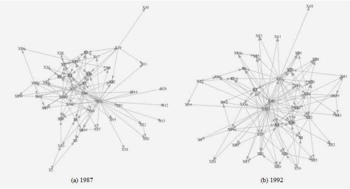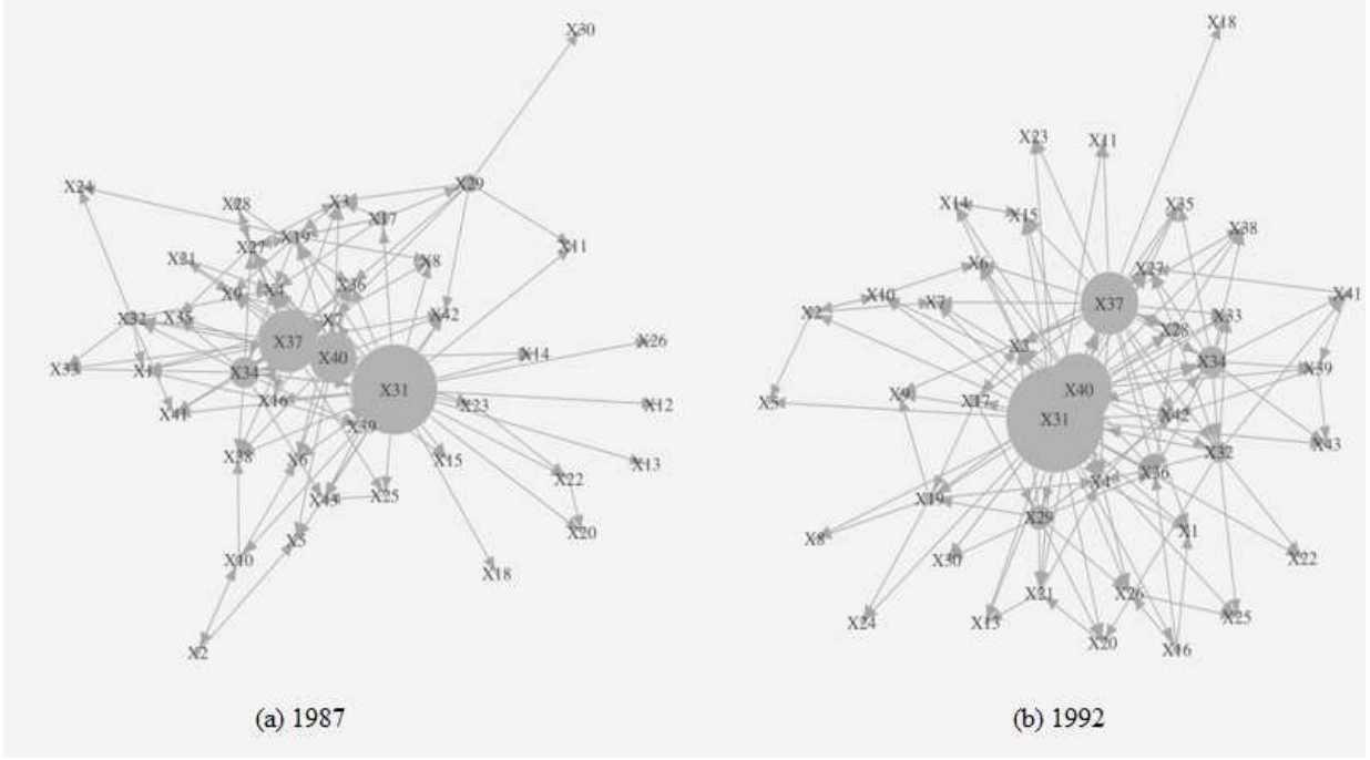 These results show that Commerce (31) was the top seller for 1967, 1972, 1987, and 1992. For 1977 and 1982, Commerce (31) was not the industry that showed the largest Outdegree but was among the industries with a significant Outdegree. In the case of 1977, the prominent sellers were Oil refineries and products (17) and Commercial services (37); the latter industry was also the preeminent seller in 1982.