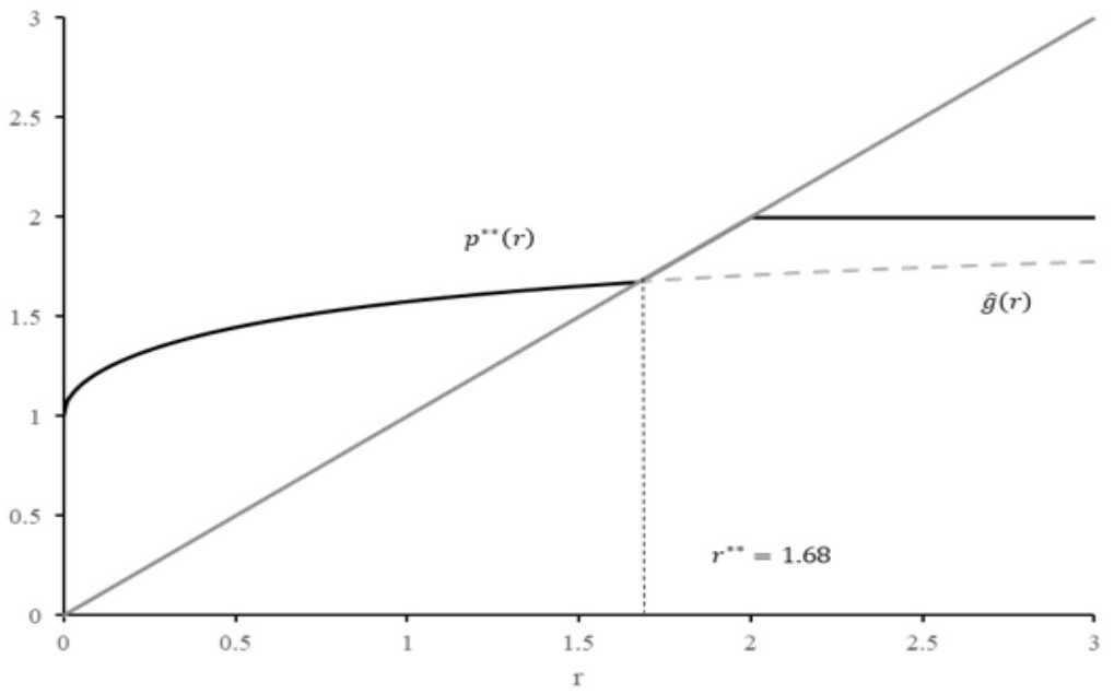 Note that the optimal reference price chosen by the policymaker crucially depends on 𝑟**, which is the unique fixed point of the function g^(r) . Hence, 𝑟** must be greater than 𝑐 and lower than c+tF . In addition, from Proposition 2, we already know that c+12tF when r**θ3 , so that the optimal reference price must satisfy the condition r**r* **<c+tF for any value of the parameters of the model, including 𝜃. According to the previous argument and the characterization of equilibrium market prices of the model (see Equation 10), it is easy to show that, in equilibrium, the optimal reference price 𝑟* ** and the symmetric equilibrium market price 𝑝**(𝑟* **) always coincide. Formally, we establish the following Corollary of Proposition 2.
