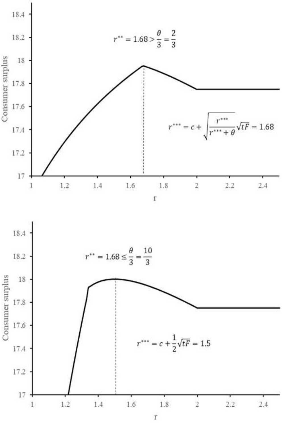 The function 𝐶𝑆(𝑟) is well-defined, continuous, and differentiable almost everywhere. Furthermore, note that, for a sufficiently large 𝑟, reference price effects become negligible for consumer surplus (or social welfare), leading to the same consumer welfare as in the model without reference price effects. This is consistent with the observation that market prices increase in 𝑟 and lie between the limits 𝑐 and c+tF .