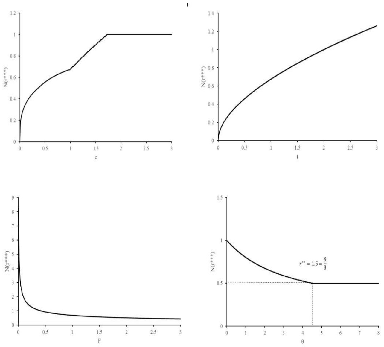 Proposition 4. The optimal number of firms 𝑁(𝑟* **) satisfies the following properties at the equilibrium market price 𝑝**(𝑟* **)=𝑟* **: