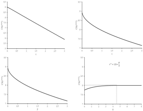 Based on the previous result, we can expect a decrease in social welfare in the face of greater inefficiencies in production (an increase in marginal cost 𝑐), high entry cost (high 𝐹) that reduces the number of firms in the market, or greater horizontal differentiation (higher 𝑡) that increases transportation cost. Our model also shows that a greater reference price effect (high 𝜃) can be associated with an increase in consumer surplus, which implies that the decrease in equilibrium market prices compensates for the increase in transportation cost associated with a lower number of firms in the market (figure 6).