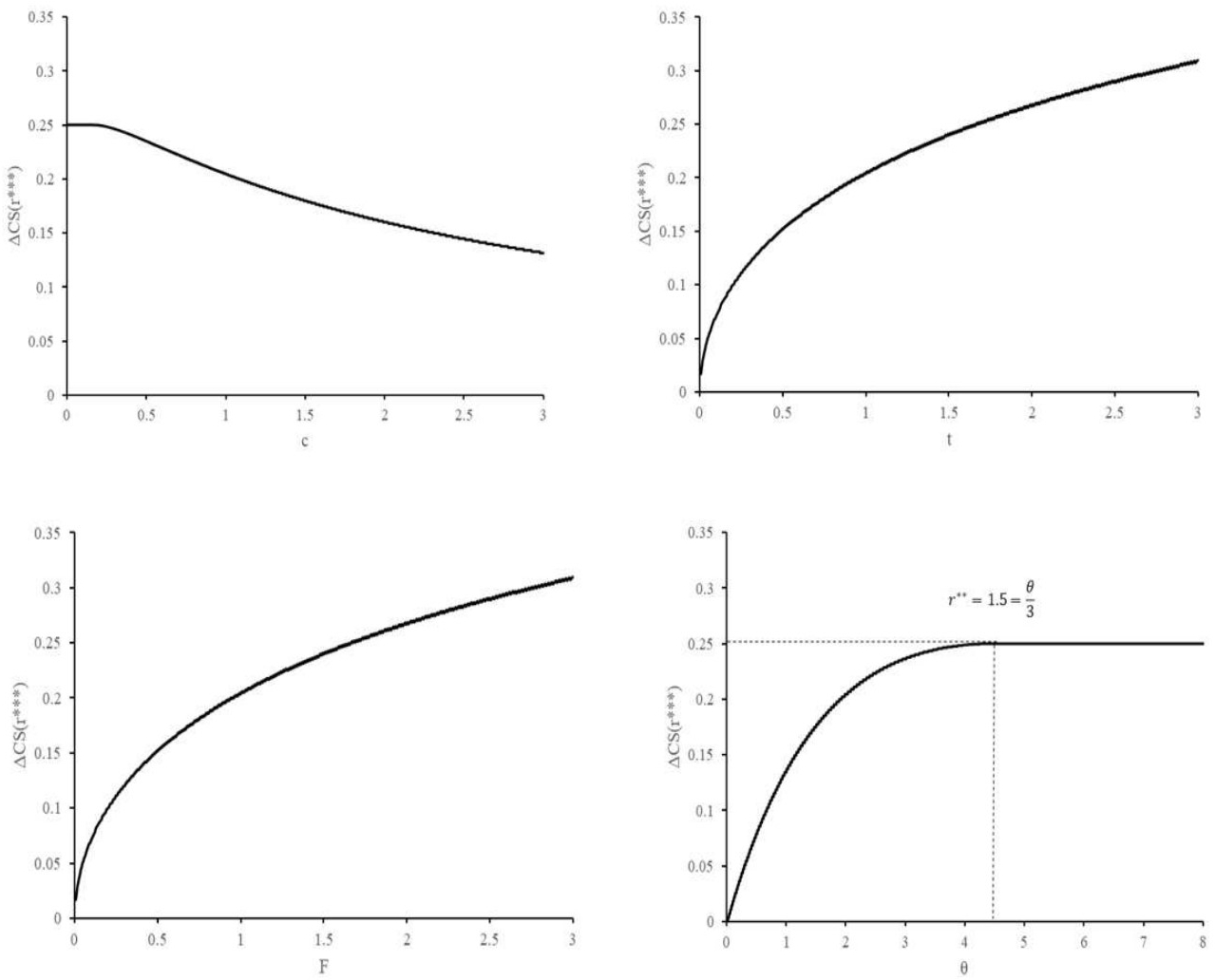 Corollary 2. The difference in social welfare Δ𝐶𝑆(𝑟,𝑐,𝑡,𝐹,𝜃) satisfies the following properties at 𝑟* **: