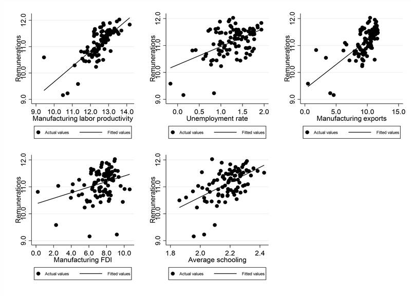 We are estimating a Feasible Generalized Least Square (FGLS) model (column 2 in Table 6) because the Panel Fixed Effects do not show homoscedastic errors (see Appendix A). All variables are statistically significant, except for manufacturing FDI per worker and the 2013 dummy variable. The unemployment rate does not show the expected sign but is statisticallysignificant at a 95% confidence interval. This estimation shows that an increase of 1% in manufacturing labor productivity impacts 0.33% on average remunerations.
