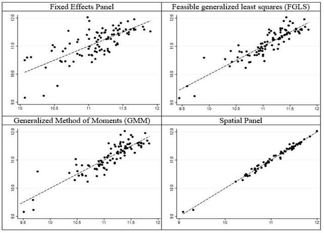 Finally, R squared and adjusted R squared are displayed at the bottom of Table 6 for goodness of fit. The magnitude of both indicators shows that the spatial panel fits better. Also, Figure B1 in Appendix B shows fitted observations derived from the same three regressions as before. As can be seen, the spatial panel fits better.