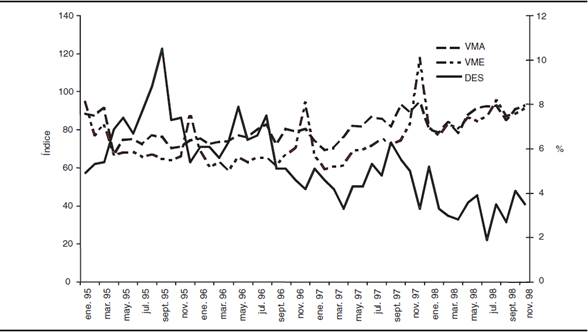Se clasificaron las variables independientes disponibles que cumplieran con los criterios de regionalidad y temporalidad en dos grupos: socioeconómicas y atributos. Entre las primeras se encuentran el valor total de la producción de la industria de la construcción (VPC), el índice de ventas del comercio al mayoreo (VMA), el índice de ventas del comercio al menudeo (VME) y la tasa de desempleo abierto (DES). Las variables que forman el grupo de atributos son las tarifas de pasajeros por avión (TA), ferrocarril (TFE) y autobús (TAU). Estas variables se construyeron de acuerdo con lo descrito en la subsección anterior.