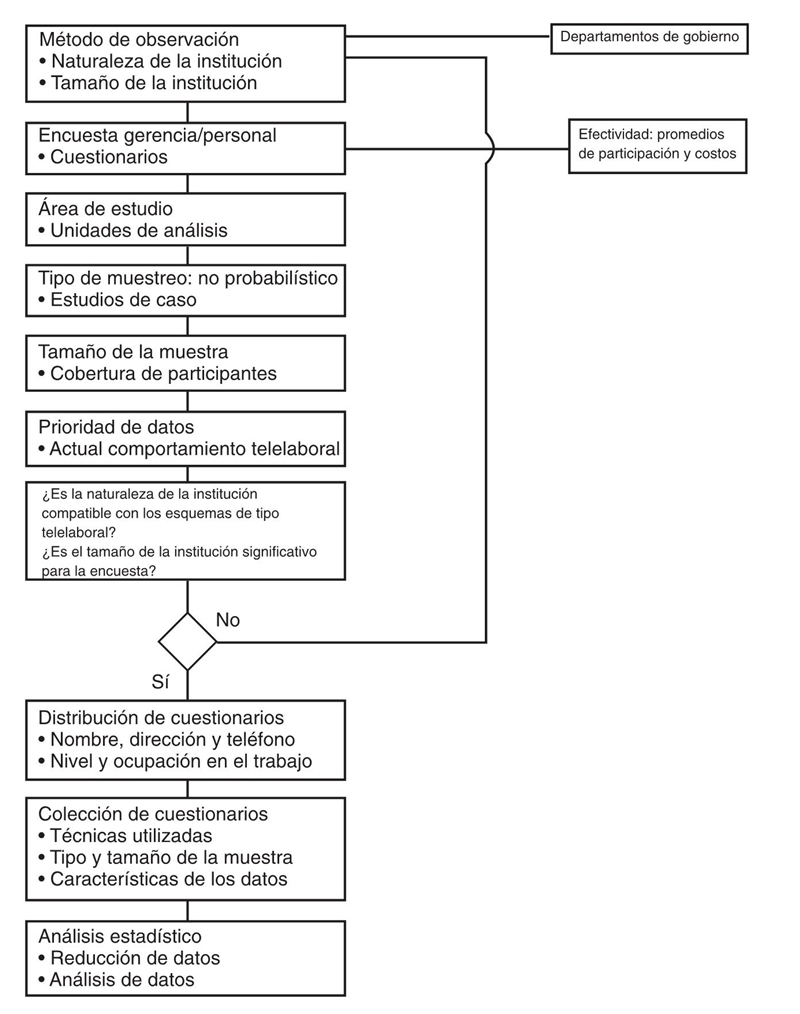 Para las exploraciones de campo (o encuestas) antes referidas fueron establecidos dos puntos principales: 1) determinar el porcentaje de gerentes o jefes que apoyan el concepto telelaboral en el trabajo, y 2) identificar el porcentaje de empleados que aceptan dicho concepto. Con objeto de satisfacer operacionalmente estos puntos fueron consideradas todas las limitantes que en su oportunidad se presentaron al aplicar el enfoque metodológico de los estudios de caso descritos a las etapas de colección y análisis de datos, para así ofrecer la más representativa descripción telelaboral.